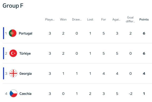 欧洲杯F组第3轮,土耳其2比1绝杀捷克,以小组第2身份晋级,16强将对阵奥地利;格鲁吉亚小组第3晋级(16强对西班牙),捷克被淘汰。